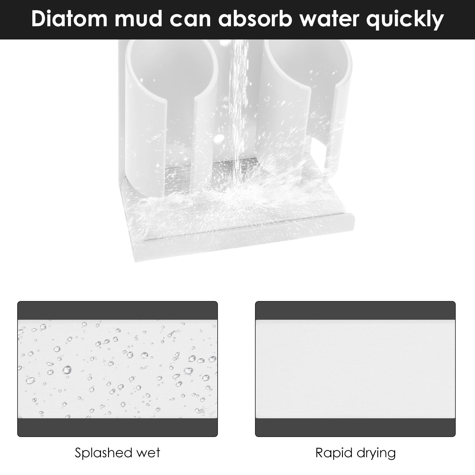 Adhesive toothbrush holder with diatomite dish at bottom to keep toothbrush dry and can also place toothbrush charger (Note: Before purchasing, check the size of the charger to see if it can be placed on the base)